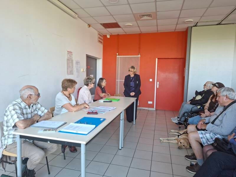 Les membres du bureau. Anne P, Dominique B, Chantal C et Paul attentifs au discours de Madame Tennenbaum, avec Amandine et son chien de guide Salsa.