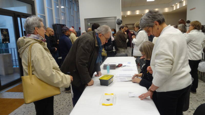 Les membres bénévoles, sympathisants et déficients visuels sont rassemblés dans le hall d'entrée pour écouter les instructions données par Dominique