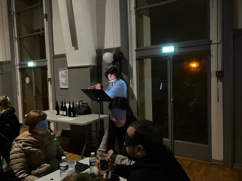 Voici mes ressentis : Les 3 jeunes filles du service national universel (Jeanne, Candice et Sélène), qui nous plaçaient à table, étaient très bien. Elles étaient douces et souriantes. Pour ma part, il y a eu une très belle évolution relationnelle à ma table : une invitée a découvert qu'être dans le noir l'oppressait. J'ai essayé de la rassurer en la touchant, en lui décrivant autant que possible la salle, ce qui s'y passait. Elle a souhaité continuer les yeux bandées jusqu'au bout et je l'ai félicitée pour cela. C'était vraiment une belle soirée très réussie. Un grand merci à toi, à Laurent et à tous les autres participants. La musique était magnifique. J'ai tout particulièrement savouré la chanteuse. Je l'ai écoutée les yeux bandés et mon plaisir fut encore plus intense. Tu peux être très fière de ton association.